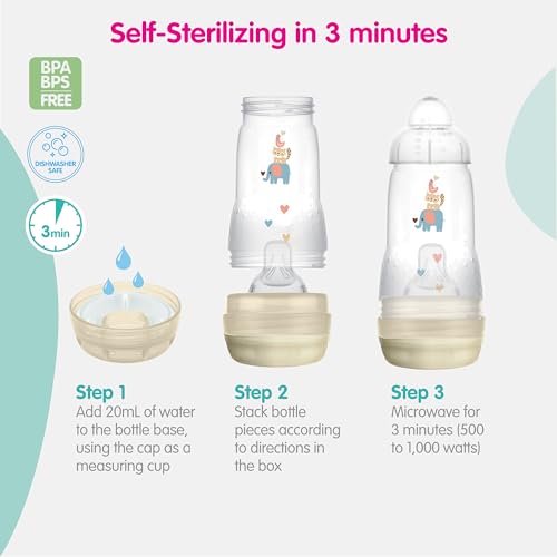 MAM Easy Start Matte Self-Sterilizing Anti-Colic Bottle is the ideal bottle for newborns. Whether you’re using baby formula or expressed breast milk, MAM bottles will support you every step of the way — the elongated nipple shape feels just like mom so you can easily switch between breastfeeding and bottle feeding. Our 5 oz MAM Easy Start Self-Sterilizing Anti-Colic Bottle is the perfect fit for newborns. The innovative vented base allows for an even drinking flow, helping to reduce colic for 80%* of babies. Each MAM Anti-Colic Bottle is self-sterilizing in three steps: fill in the base with 20ml of water, put the nipple on the base and close the bottle. Heat the bottle in the microwave for 3 minutes. The bottle is made from BPS and BPA free materials, and the removable bottom makes clean-up a snap. It comes with 2 MAM Slow Flow Silicone Nipples for babies 0 months and older, accepted by 94% of babies.** Our bottles for babies make perfect registry and baby shower gifts! *Field study, Austria 2011, tested with 73 mothers of colicky babies / Market research, USA 2010, tested with 35 mothers of colicky babies. **Market research 2010-2020, tested with 1,572 babies
