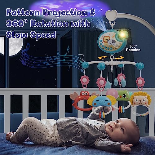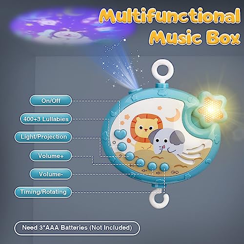 Removable pattern projection music box:The music box projects the colorful cartoon image onto the ceiling.It will fully cultivate curiosity and stimulate baby’s imagination. Take along mobile lets your baby take the fun to anywhere.It requires 3 x 1.5V AAA batteries (Not Included)