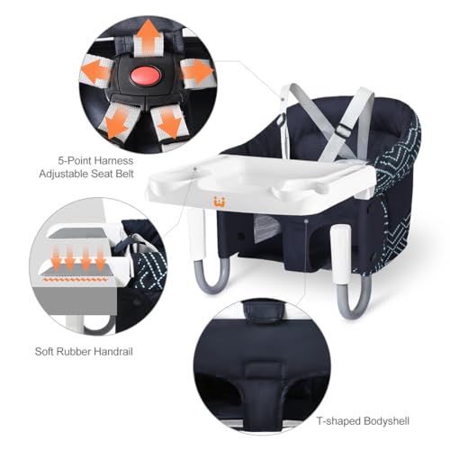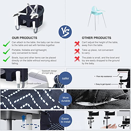 [Safe & Comfortable Table Chair] The hook on high chair that attaches to table have adjustable 5-point harness secured in the seat even the baby leaning backwards to protectionyour baby.The table seat was built-in 12mm cotton cushion,Guaranteed comfort and breathability.