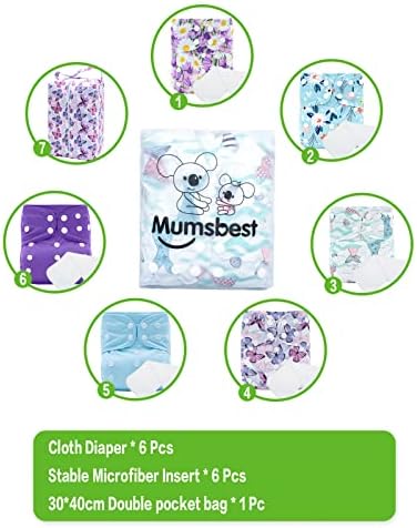 Mumsbest Cloth Diaper for Baby Girls and Boys with Tummy Panel, 6 Pack Reusable Adjustable Washable AWJ Lining Pocket Nappy with 6 Inserts & 1 Diaper Wet Bag (Plants Flowers Animals 04)