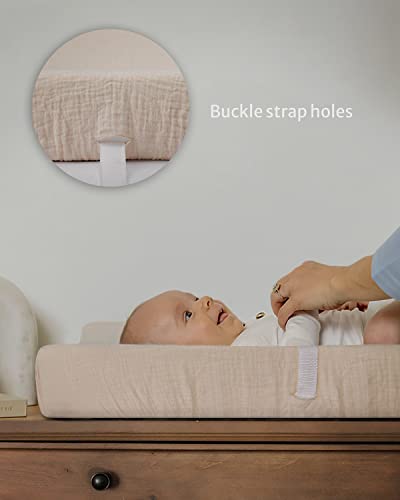 Fits Most Changing Pads – With 6″ deep pockets, our changing pad cover fits standard changing pads (32″ x 16″ x 4″), and cradle mattresses on the market. Muslin changing table cover has buckle strap holes to suit the harness.