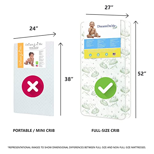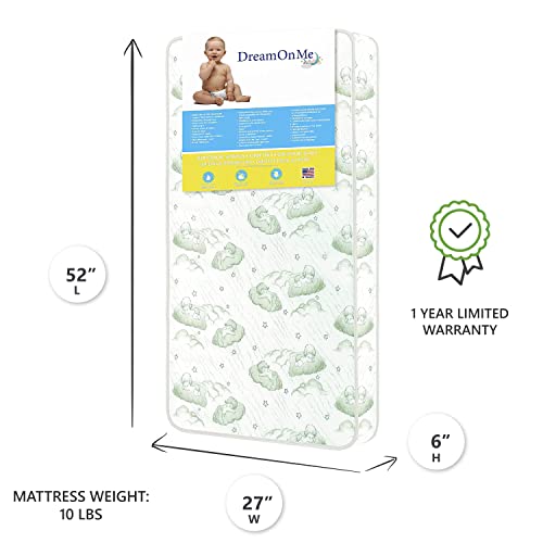 The Dream On Me Nirvana 6” 96 Coil Inner Spring Crib And Toddler Mattress is all about unparalleled safety, comfort and durability. Made in the USA, this mattress is Greenguard Gold certified and meets/exceeds all flammability (16 CFR 1632/1633), phthalate, lead & toxicity tests. It is constructed with a layer of fire blocker and comes with a 10-year manufacturer warranty. The Dream On Me Nirvana 6” 96 Coil Inner Spring Crib And Toddler Mattress creates a firm sleeping foundation for your child courtesy a core of 96 interwoven, heat tempered, spring steel coils. Comfort is assured with the protective polyurethane foam wrap on either side. The reinforced waterproof cover locks out moisture and stains while the metal-free airflow pockets ensure freshness. To clean, simply wipe with soap and water. Durable features like a fiber insulating layer and lockstitch waterproof binding make the Dream On Me Nirvana 6” 96 Coil Inner Spring Crib And Toddler Mattress a long-term investment, suitable for both standard size cribs and toddler beds. Product dimensions are 52” L x 27” W x 6” H and it weighs 11.5 Lbs. It comes in a vinyl cover with a blue cloud and baby print. Safety Advice: Flip and rotate mattress every 2-3 months Ensure mattress covers/fitted sheets aren’t too tight/loose