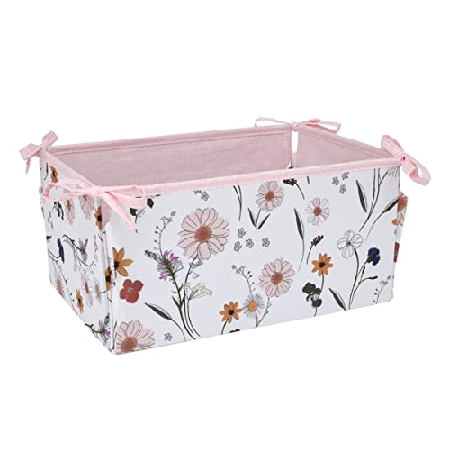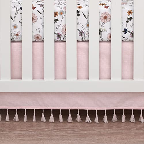 The NoJo Keep Blooming 4 Piece Crib Bedding Set includes a comforter, a 100% cotton fitted crib sheet, a crib skirt, and reversible storage. The linen look comforter is detailed with applique and embroidery with pretty wild flowers, vines and a cute little fox, bunny and bird. Features soft pink corner ties with florals in pink and white, lavender, purple and gold with an embroidered message – Keep Blooming Sweet Girl! Reverses to a lovely floral pattern. Measuring 36″ x 45″, this comforter is perfect for tummy time! The 100% cotton fitted crib sheet is fully elasticized for a safe and snug fit and fits a standard size crib/toddler mattress that measures 28″ x 52″. Features a white ground with pink, purple, and gold flowers. The crib skirt is solid dusty pink and trimmed in pink tassels. Measures 27″ x 51″ with a 14″ drop. The reversible storage has four pink ties and is decorated in white with pink, lavender, purple and gold florals. Measures 12″ x 6″ x 8″ – perfect for keeping your nursery tidy! NoJo Only the Best for Baby!