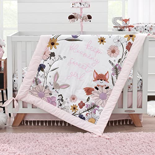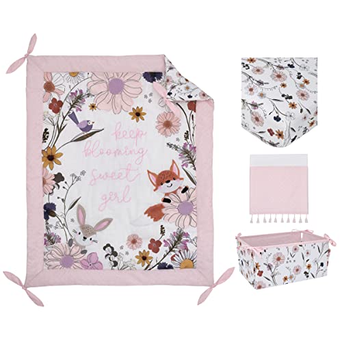 NoJo Keep Blooming Pink, White, Purple and Gold Woodland “Keep Blooming Sweet Girl” 4 Piece Nursery Crib Bedding Set – Comforter, 100% Cotton Fitted Crib Sheet, Crib Skirt, and Storage