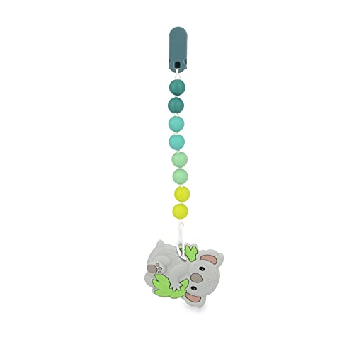 Nuby’s Silicone Drop Pacifinder clips and releases easily from clothing and works with both handle and knob style pacifiers. It comes with a fun character teether that will help sooth your little one as their teeth start coming in.