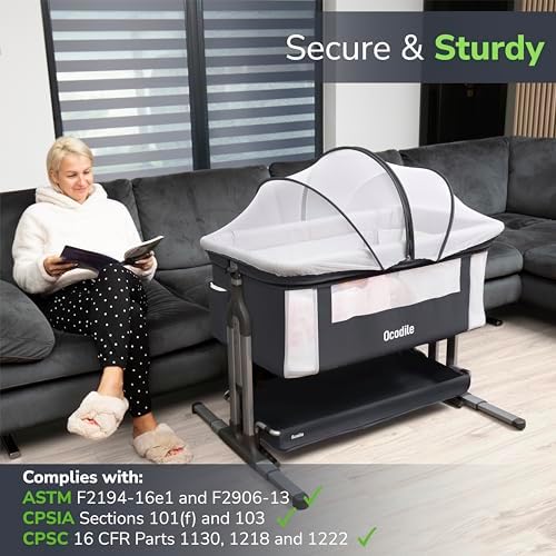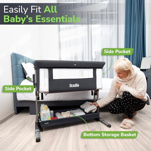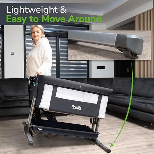 Ocodile Baby Bedside Sleeper, Cosleeping Baby Bed with Adjustable Height, Extra Storage and Integrated Wheels. Bassinets for Newborn Babies – Dark Gray
