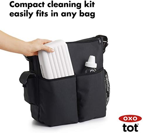 Make cleaning up away from home hassle-free with the OXO Tot On-the-Go Drying Rack with Bottle Brush. This compact cleaning kit is small enough to easily fit into diaper bags or purses while on the road. It opens into a drying rack with flexible tines that accommodate bottles, nipples, breast pump parts and more. Neatly tucked inside the folded drying rack are a silicone detail cleaner and bottle brush head that assemble to form a full-sized bottle brush. The brush has soft and firm bristles for gentle cleaning or serious scrubbing, plus a soft, non-slip handle. The silicone detail cleaner scrubs tight spots like bottle nipples and breast pump parts more effectively than bristles can. Ventilation holes provide aeration for quick drying, so you can say good-bye to wet brushes in inconvenient plastic bags. Dimensions: Open: 8.5 x 10.8 x 2.2 inches