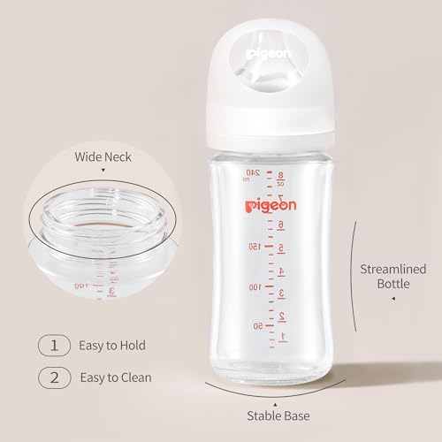 Pigeon Glass Nursing Bottle Wide Neck, Streamlined Body, Natural Feel, Easy to Clean, Heat-Resistant, 8.1 Oz(Pack of 2), Includes 2pcs M Nipples (3m+)
