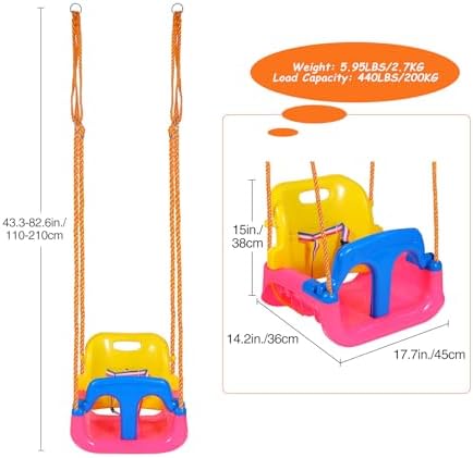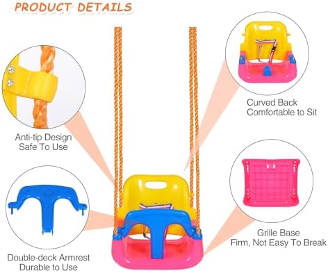 Safe & Sturdy: Grids seat base and 4 nylon ropes make the swing sturdy and strong. Backrest with a safety belt, T-shaped handrail and dinner-plate armrest can keep kids in right position and ensure safety. Anti-tip buckles for nylon rope protect the swing from tipping.
