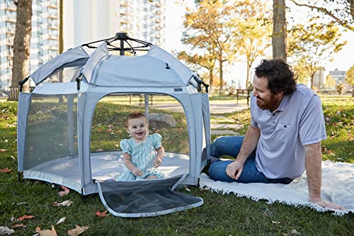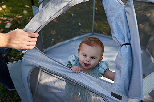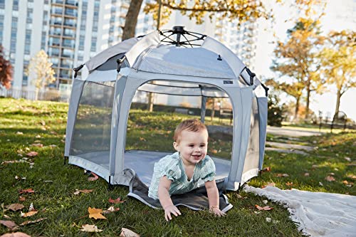The Safety 1st InstaPop Dome Play Yard sets up in the blink of an eye. Pull it up, pop it into place, and your child is ready to play in a safe space. The roof windows unzip for increased air flow or zip up for sun protection. The breathable mesh sides keep baby cool on warm summer days. When youre done playing, press the play yard down, snap it into place, and youre good to go.