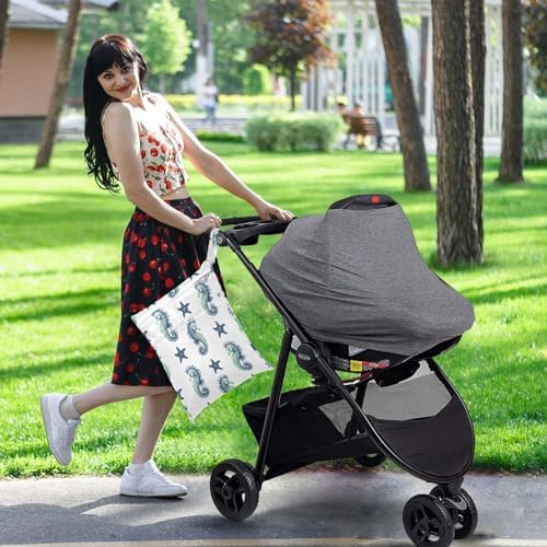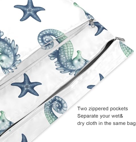 Sea Horse Starfish Wet Dry Bags for Baby Cloth Diaper 2 Pack, Waterproof Reusable Wet Bag with 2 Zippered Pockets for Travel Swimsuit Gym Clothes Toiletries Stroller