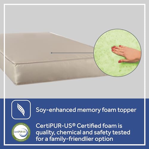 2-STAGE FIRMNESS — On the infant side, a luxurious organic cotton and firm layer provide comfort and stability. The toddler side features a soybean memory foam layer for comfort.