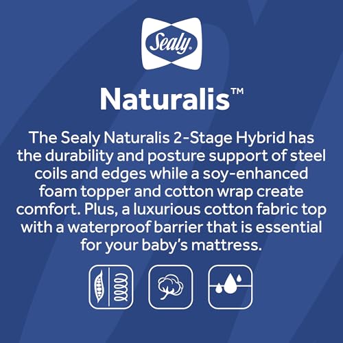 Sealy Naturalis Premium Hypoallergenic 2-Stage Dual Firm Waterproof Baby Crib Mattress & Toddler Bed Mattress, Non-Toxic Crib Mattress, Natural Cotton, Hybrid Coil & Memory Foam, Made in USA, 52″x28″