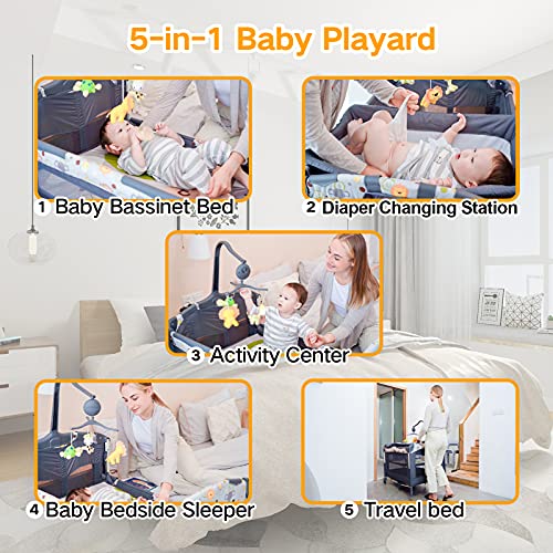 SKIH 5 in 1 baby bedside Sleeper, Bassinet with Toys & Music Box, Mattress, Foldable Playard, Portable Travel crib for Girl Boy Infant Newborn (Grey)