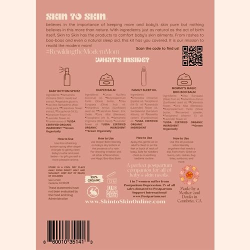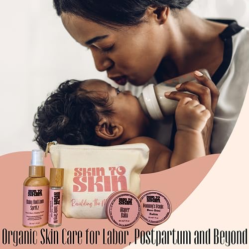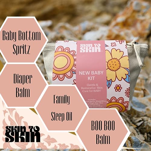 Skin to Skin New Baby Kit – 4 Piece Set in Cosmetic Bag – Includes: Baby Bottom Spritz, Family Sleep Oil, Diaper Balm, and Boo Boo Balm – Organic Baby Butt Balm – Postpartum Essentials