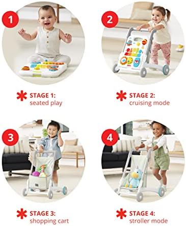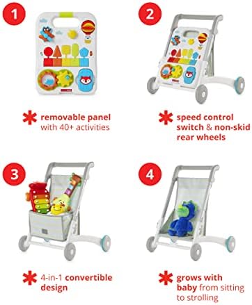 Packed with 40-plus play features, songs, sounds, lights and more, our convertible activity walker helps little ones learn and grow with four engaging ways to play: seated, cruising, shopping cart and stroller. Great for encouraging balance, fine motor skills, pretend play and more, it’s a grow-with-baby must-have that delivers tons of learning and fun for years to come.