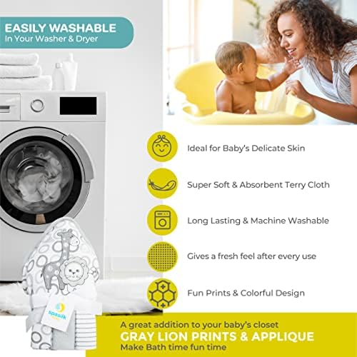 Baby Bath Essentials: Our baby bath set includes a terry hooded towel and three baby washcloths with a unique, and embroidered gray lion design. This set has soothing and coordinated gray colors that your baby will love.