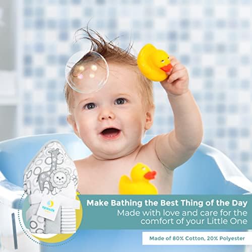 Get these soft and easy-to-use hooded towels and washcloth set to make the bath time fun and amuse your little ones. This Spasilk baby bath set is made of premium, and absorbent cotton to dry your baby quickly while wrapping them in comfort. The baby bath cloths come with hoods to keep your baby warm. These baby washcloths are lightly textured and very plushy to get your baby clean and dry quickly. Our baby bath set includes a terry hooded towel and three baby washcloths with a unique, and embroidered gray lion design. Don’t fret about the gift while attending a baby shower. Spasilk has offered a gray baby bath set, which is a perfect gift for newborns. Pamper them with a soft touch and smooth feel. This baby hooded towel and washcloth set is soft, gentle, and machine washable. The washcloths measure 9″ X 9″, and the hooded towel measures 30″ X 26″, which is an ideal size to wrap your baby. Keep your kids warm, fresh, and clean with this fluffy baby bath set