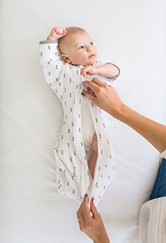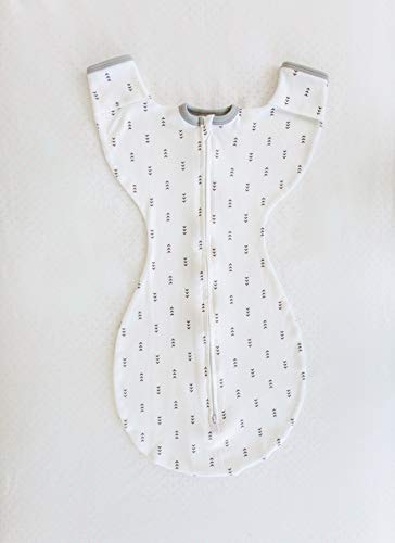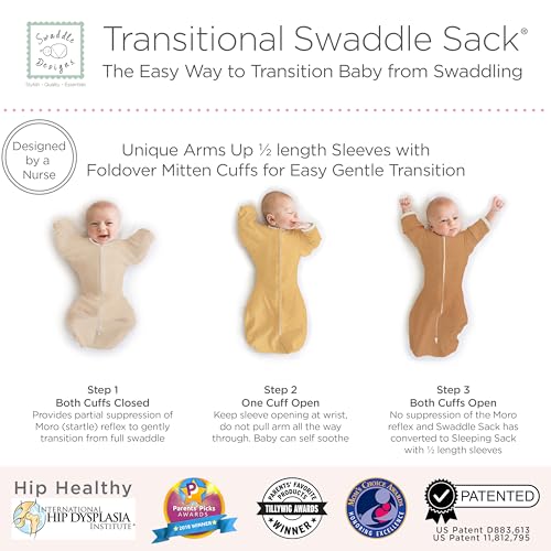 The Transitional Swaddle Sack is the easiest & safest way to wean baby from a traditional swaddle. The arms up sleeve design allows baby to self-soothe and the unique ½-length sleeves with foldover mitten cuffs closed provide partial suppression of the Startle Reflex to promote better sleep. Importantly, the patented design is safer because baby can use their arms if baby rolls over during sleep. The Transitional Swaddle Sack is ideal for babies who prefer to sleep with arms up, babies who are starting to rollover, and babies who break out of a traditional swaddle. The uniquely-shaped, ½-length sleeves are not full length, so when mitten cuffs are closed, baby’s arms will be flexed close to body for swaddle snugness. The foldover mitten cuffs may be worn open or closed. Caregiver can open one or both cuffs, so baby can self-soothe by sucking directly on hand. Helpful 2-way zipper with 2 zipper pulls. The zipper zips down from the top to make it easy to place baby in the sack and zips up from the bottom to make it easy to change baby’s diaper. Designed by a nurse. US patent, D883,613 with patents in EU, UK, China, Japan, Korea.