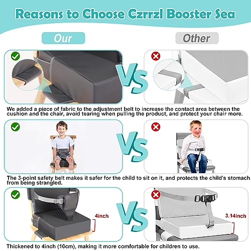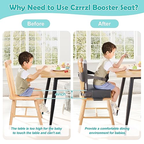 [Perfect size] The portable booster seat has a backrest size of 12.6 x 12.6 x 1.57 inches and a cushion size of 12.6 x 12.6 x 4 inches, making our kids booster seat suitable for most dining chairs. We have also increased the length of the bottom seat belt to better secure the seat cushion to the chair. Note: Due to packaging compression, the product will return to its original height within 24-48 hours after opening