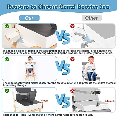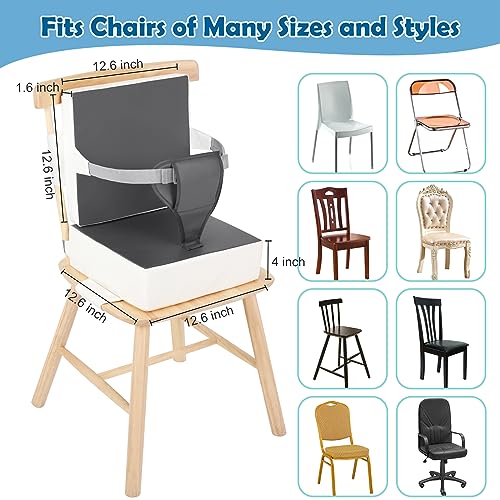 [Perfect size] The portable booster seat has a backrest size of 12.6 x 12.6 x 1.57 inches and a cushion size of 12.6 x 12.6 x 4 inches, making our kids booster seat suitable for most dining chairs. We have also increased the length of the bottom seat belt to better secure the seat cushion to the chair. Note: Due to packaging compression, the product will return to its original height within 24-48 hours after opening