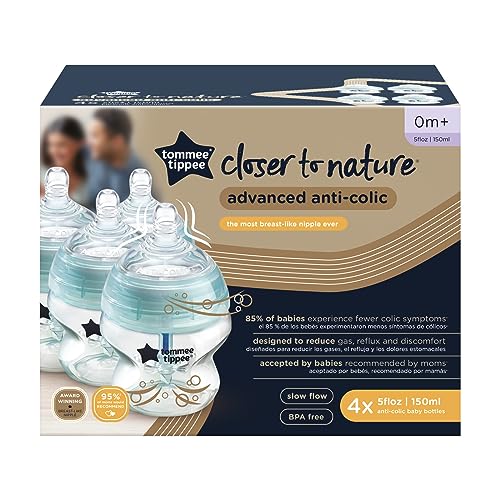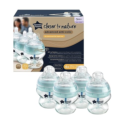 Tommee Tippee Advanced Anti-Colic Newborn Baby Bottle, 5oz, Slow-Flow Breast-Like Nipple for a Natural Latch, Triple-Vented Anti-Colic Wand, Pack of 4