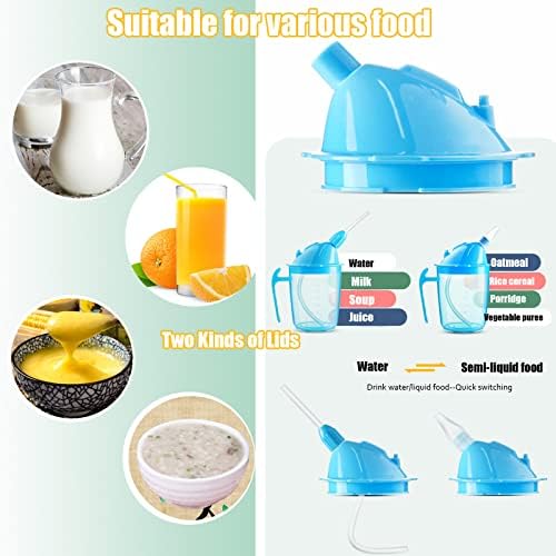 Much Spill Proof Design:For people who often lie in bed and need to take care, drinking water and porridge will cause things to spill, our Drinking Cup can solve it for you, this feeding cup is designed with a sloping spout for easy use, and the unique lid controls the flow and prevents spillage