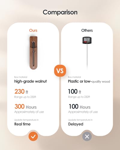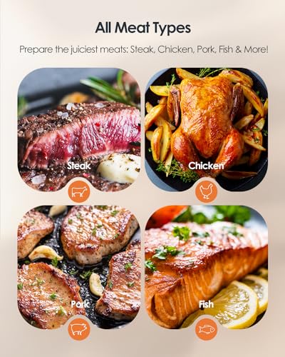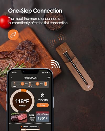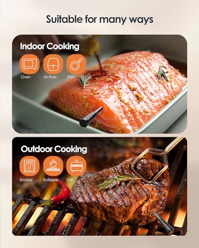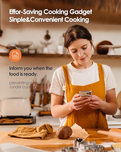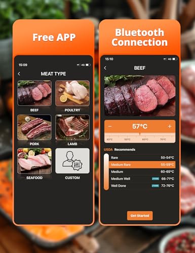 【Easy-to-Use Multifunctional App】The intuitive application offers target temperature settings, real-time alerts, customizable timers, temperature charts, and 26 USDA presets. Every time you use our meat thermometer digital wireless, you can achieve perfect and consistent results like a professional chef by following the recommended preset temperatures.