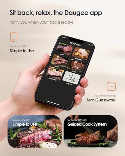 【Better Cooking Experience】 Cooking should be enjoyable! The Daugee meat thermometer bluetooth is the ideal choice for indoor and outdoor cooking enthusiasts. Perfect for electric grills, smokers, ovens, griddles, or sous vide cooking, you’ll effortlessly achieve top-quality and flavorful dishes, making you the star chef of any event! (1. Please remember to insert it deep enough into the meat and beyond the safety cooking line each time you barbecue, to avoid damage to the probe from high temperatures. 2. Remember to wait until the probe is cool enough before cleaning to prevent damage from sudden temperature changes.)