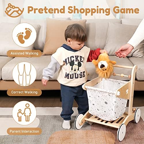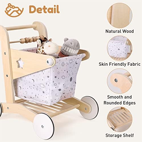 Wooden Baby Push Walker Doll Stroller, Adjustable Speed Shopping Cart Toddler Toys, Natural Wood Push and Pull Learning Walker Educational Birthday Toy for Boys Girls 1 2 3
