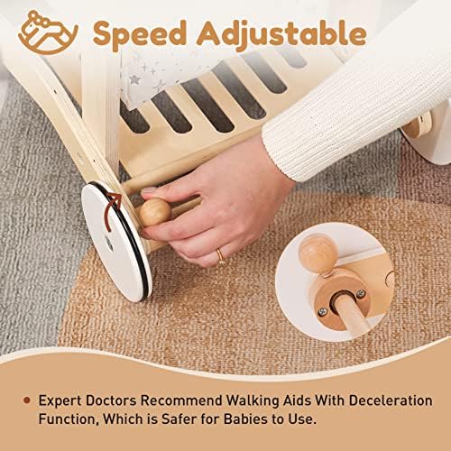 【Premium Material】The wooden baby walker is made of natural materials including European beech, New Zealand pine and American basswood, which are strong and durable. The surface uses non-toxic environmental paint, which is smooth and round. The storage bag is made of skin-friendly fabric, which makes the baby feel more natural and healthy. In order to ensure the safety of the baby, each gap of the walker is less than 5mm and more than 12mm, so that the fingers will not be caught