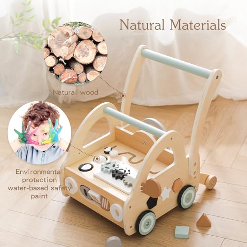 Wooden Baby Push Walker Walking Toys Learning to Walk, Activity Walker for Baby Boys and Girls, Multiple Activities Center Fine Motor Skills Toy