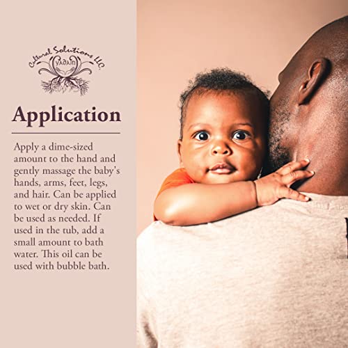 USAGE AND APPLICATION: Apply a dime-sized amount to the hand and gently massage the baby’s hands, arms, feet, legs, and hair. Can be applied to wet or dry skin. Can be used as needed. If used in the tub, add a small amount to bath water. This oil can be used with a bubble baths.